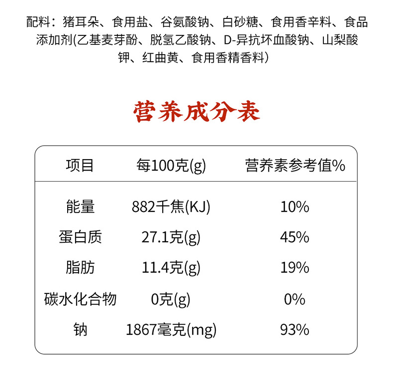 猪耳、饮用水、食用盐、味精、酱油、糖、食用香辛料、食品添加剂(脱氢乙酸钠、D-异抗坏血酸钠、山梨酸钾
