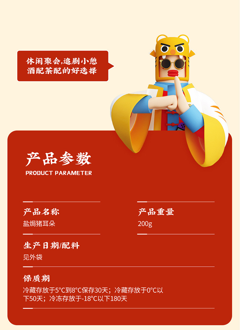 原料和配料 :猪耳、饮用水、食用盐、味精、酱油、糖、食用香辛料、食品添加剂(脱氢乙酸钠、D-异抗坏血酸钠、山梨酸钾