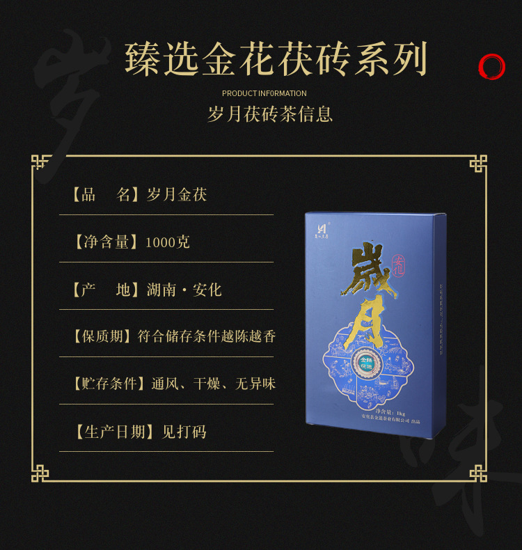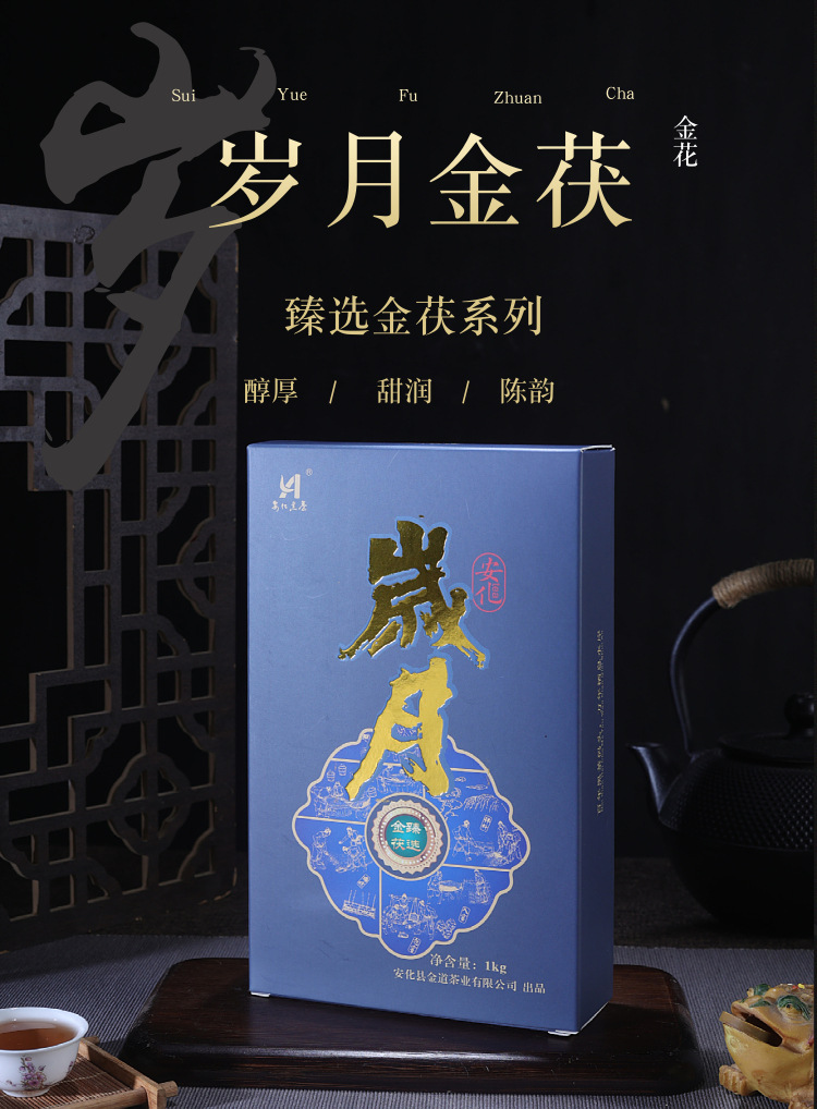商品名称:安化黑茶岁月金茯臻选金花系列1kg香茶盒装品鉴金花香