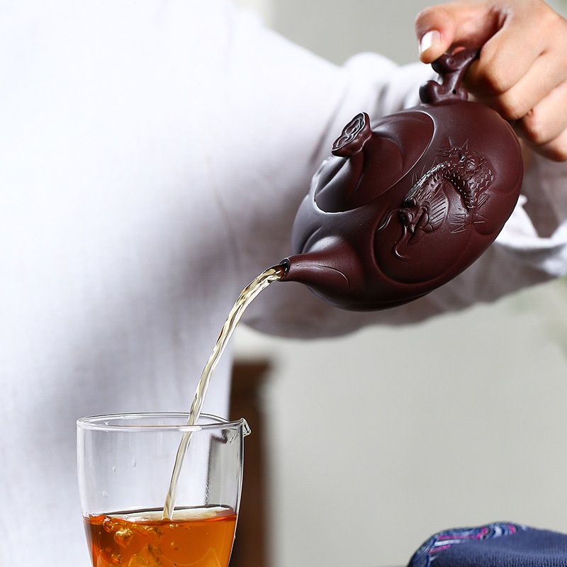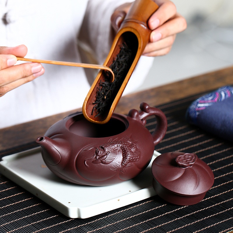 简 洁 明 快 。 鱼 龙 吐 珠 、 神 韵 生 动 。 配 以 龙 尾 执 柄妙 趣 横 生 。 工 艺 精 雕 细 镂 , 善 于 堆 花 积 泥 , 使 紫砂 壶 的 造 型 更 加 生 动 、 形 象 、 活 泼 , 使 传 统 的 紫砂 壶 变 成 了 有 生 命 力 的 雕 塑 艺 术 品 , 充 满 了 生 气与活力。