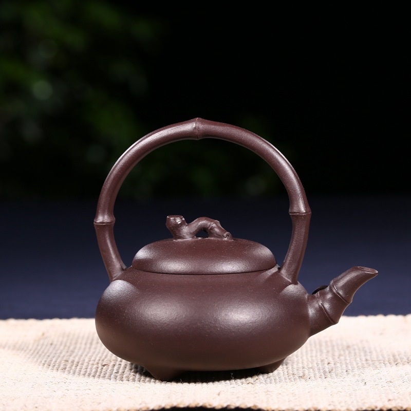 竹节提梁壶造型经典而大气,壶身比例分配得当,做工老到而精细,壶体呈扁圆形且均称,用料及其考究,采用老紫泥制作而成,壶的提梁较为圆润,过渡和缓,整体均称,隆起的盖子显得丰腴饱满,浑然一体,布局紧致而有度,构思合理。