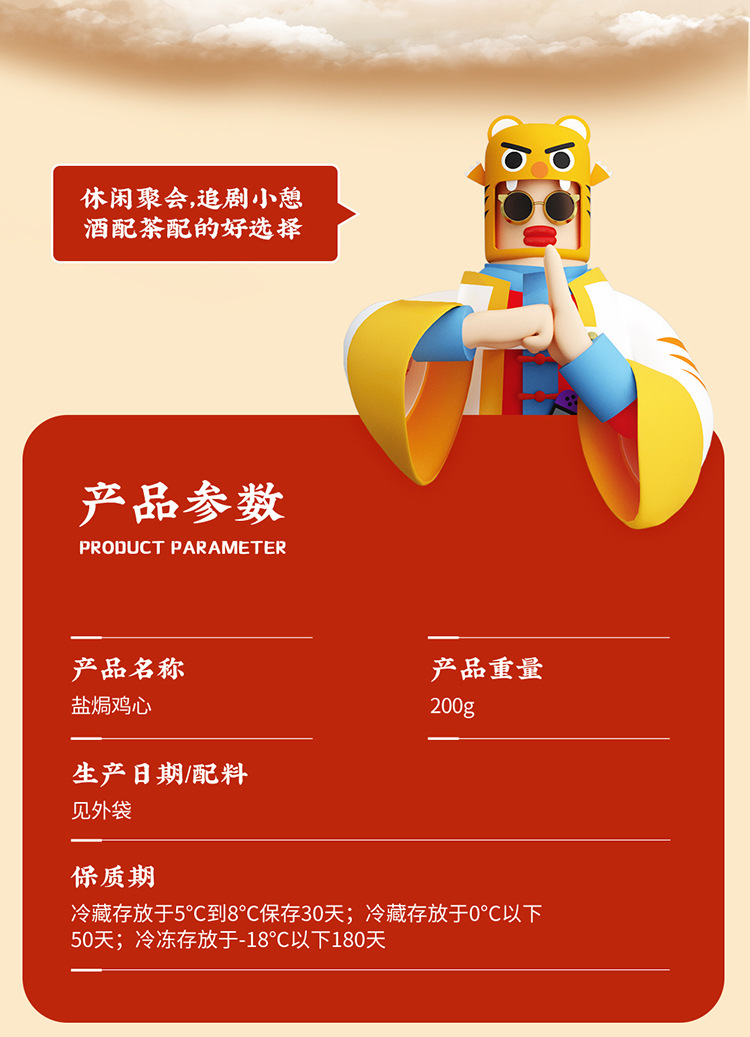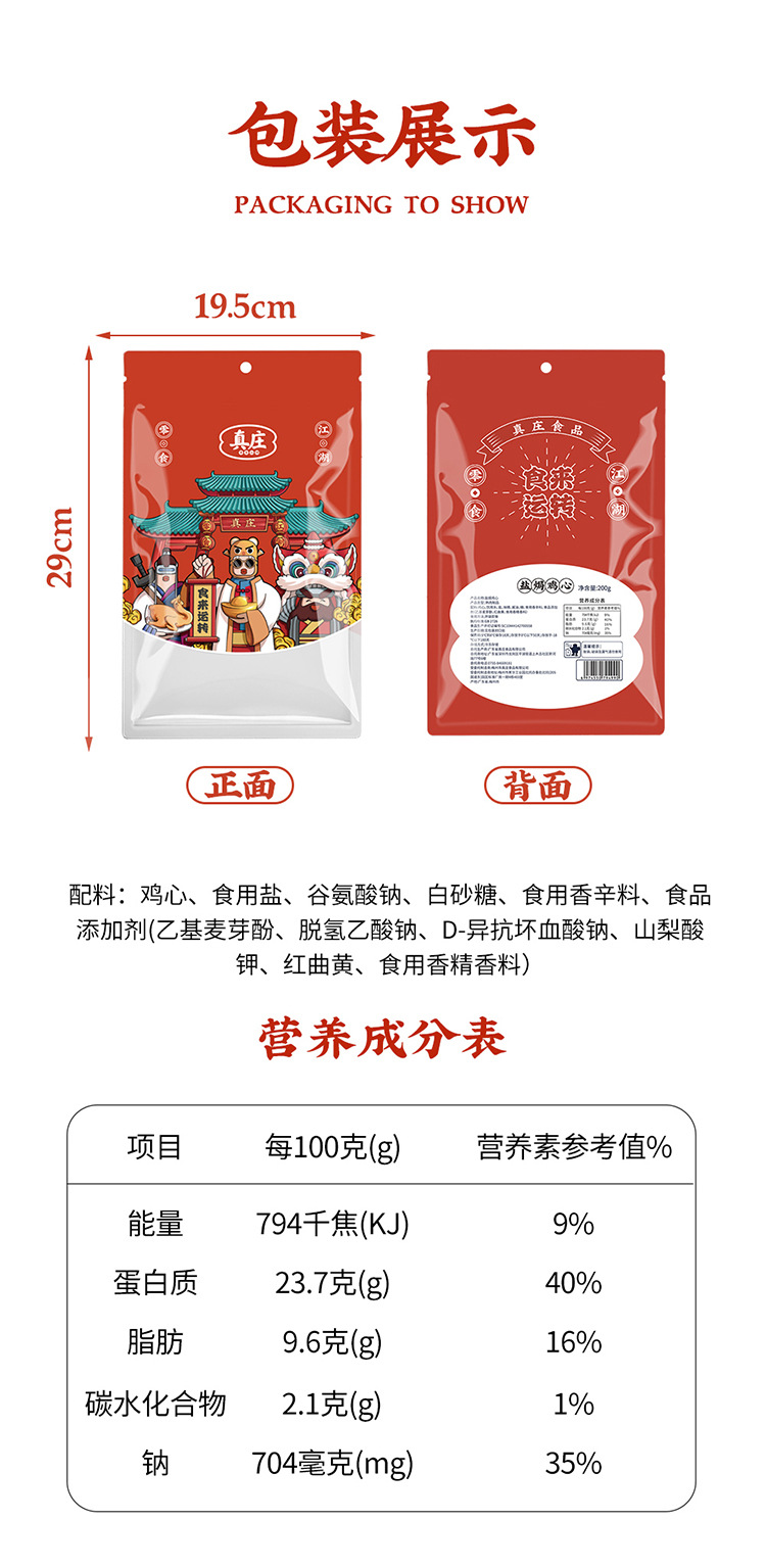 原料和配料 :鸡心、食用盐、白酒、香辛料、食品添加剂等详情请看包装