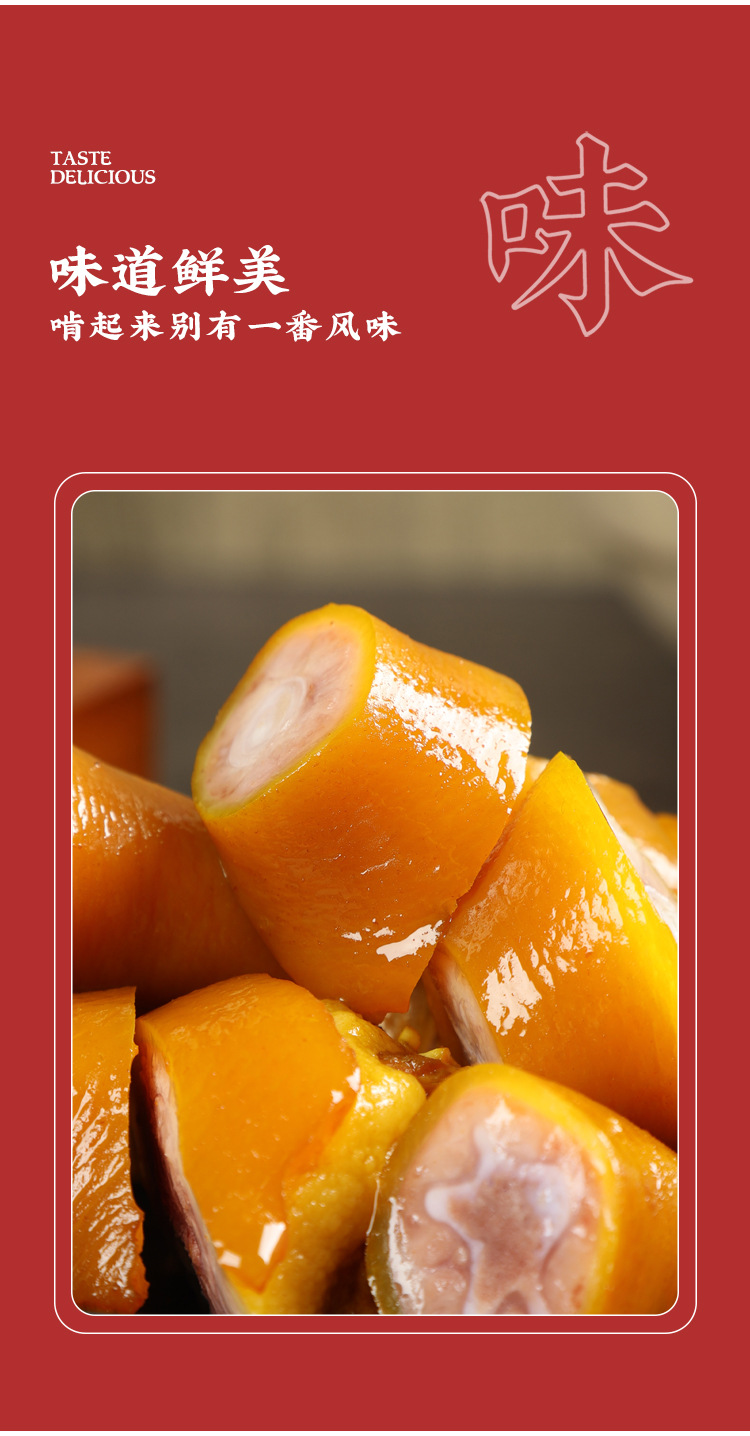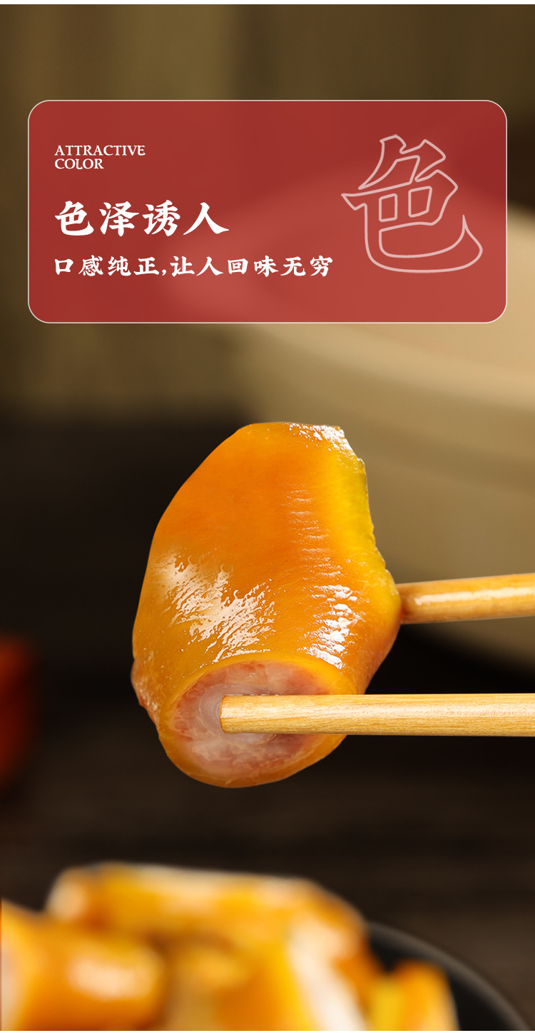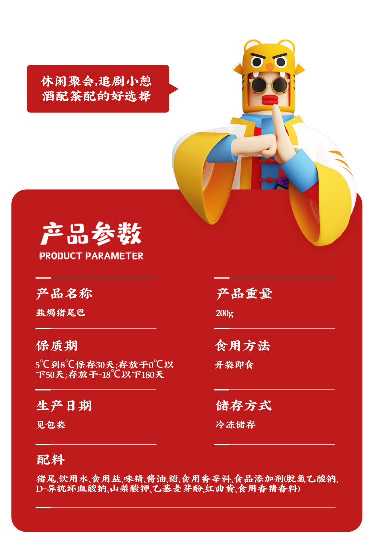 原料和配料 :猪尾 饮用水,食用盐,味精,酱油,糖,食用香辛料,食品添加剂