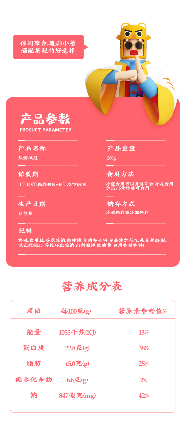 原料和配料 :鸡冠、食用盐、味精、白砂糖、食用香辛料、食品添加剂(乙 基麦芽酚、脱氢乙酸钠、D-异抗坏血酸钠、山梨