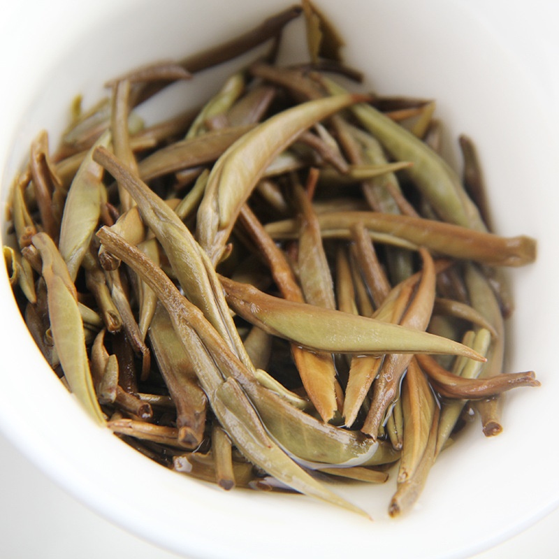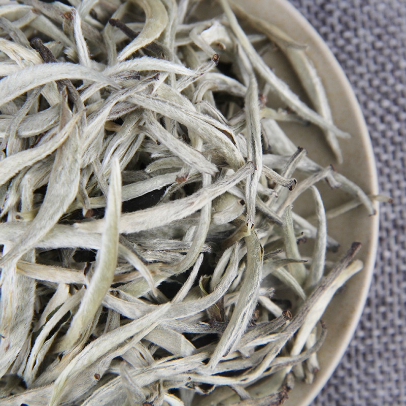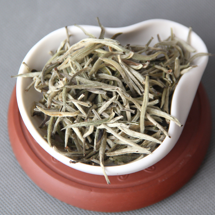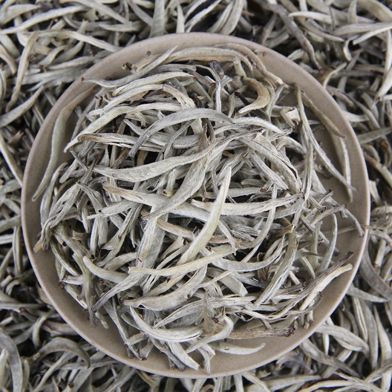 茶叶因其成茶芽头肥壮、肩披白毫、挺直如针、色白如银而得名。外形芽壮肥硕显毫,色泽银灰,熠熠有光,汤色杏黄,滋味醇厚回甘