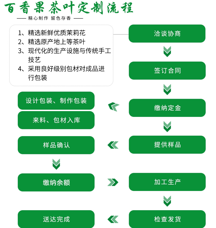 百香果茶业将中国茶和中国茶文化不断传承并发扬光大,专注茉莉花茶的制作窨制技艺。 百香果茶业致力于品牌打造和渠道建设,“窨制持久茉莉香的技艺标准”是百香果茶业的品牌发展理念。线上线下融合发展,市场份额不断扩大,将时尚理念融入传统茶文化,深入挖掘茶产品内涵,将中国茶文化与茶产品、营销紧密结合,精心打造以花茶为核心,及六大茶类共同发展的丰富茶产品线。积极探索茶叶深加工,相继推出了普洱茶、绿茶、红茶、乌龙茶、黄茶、黑茶、白茶等一系源头好茶,努力实现茶产业的多元化发展,让更多的年轻人爱上茶,更多的中年人会喝茶,更多的老年人喝好茶会是我们不懈的追求和努力的方向。传承茶文化创新的价值观,始终保持着崭新的茶行业发展活力,将中国叶茶推向更广阔的市场。