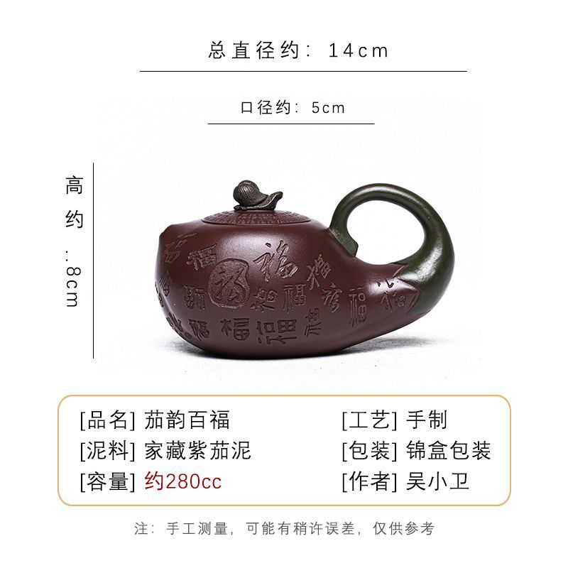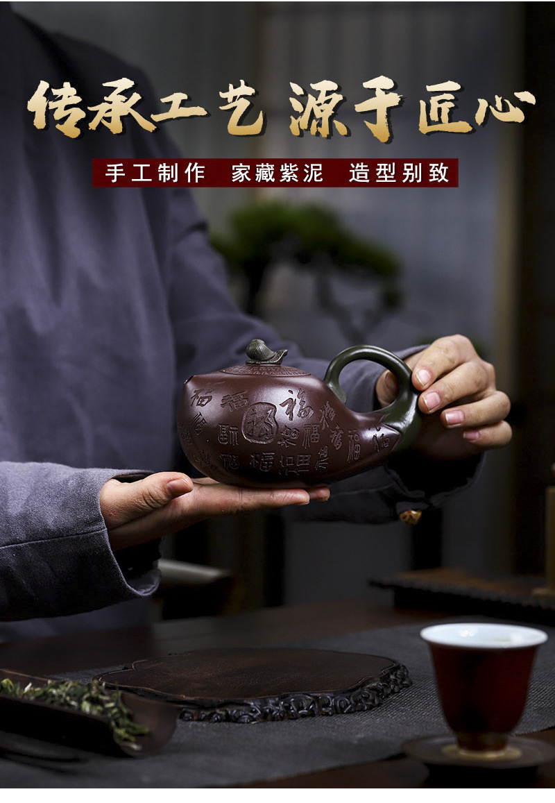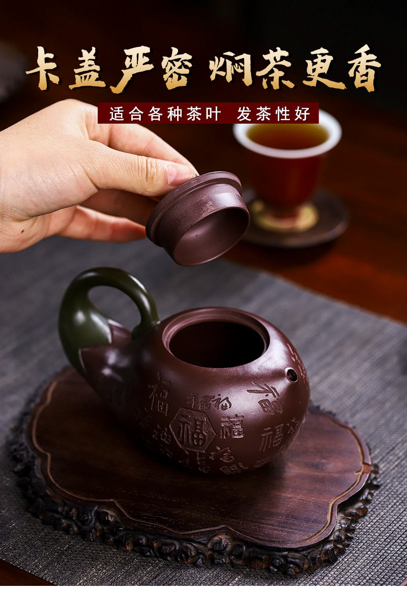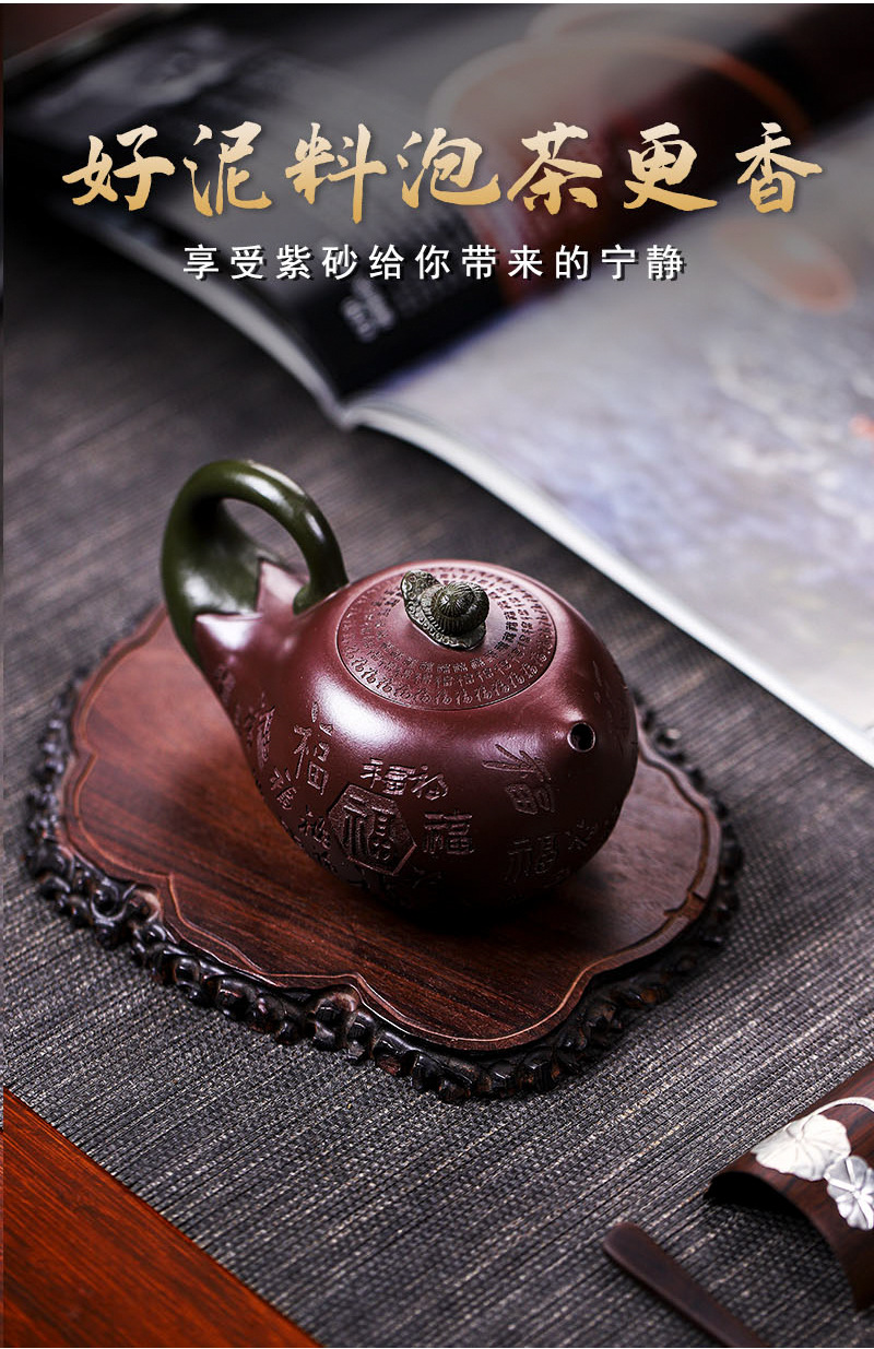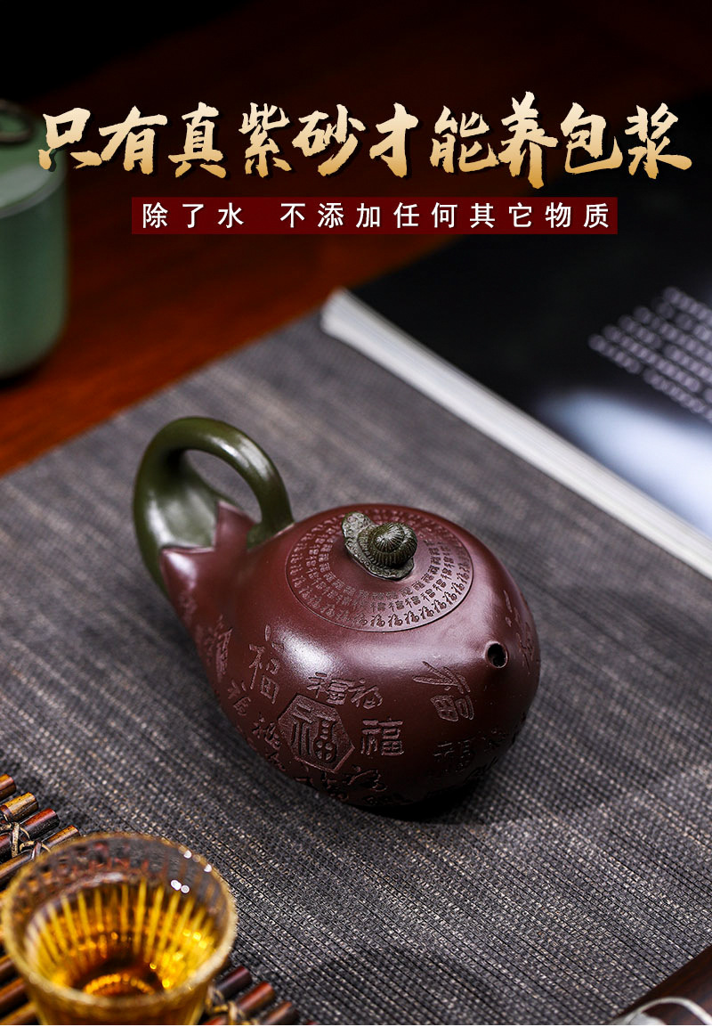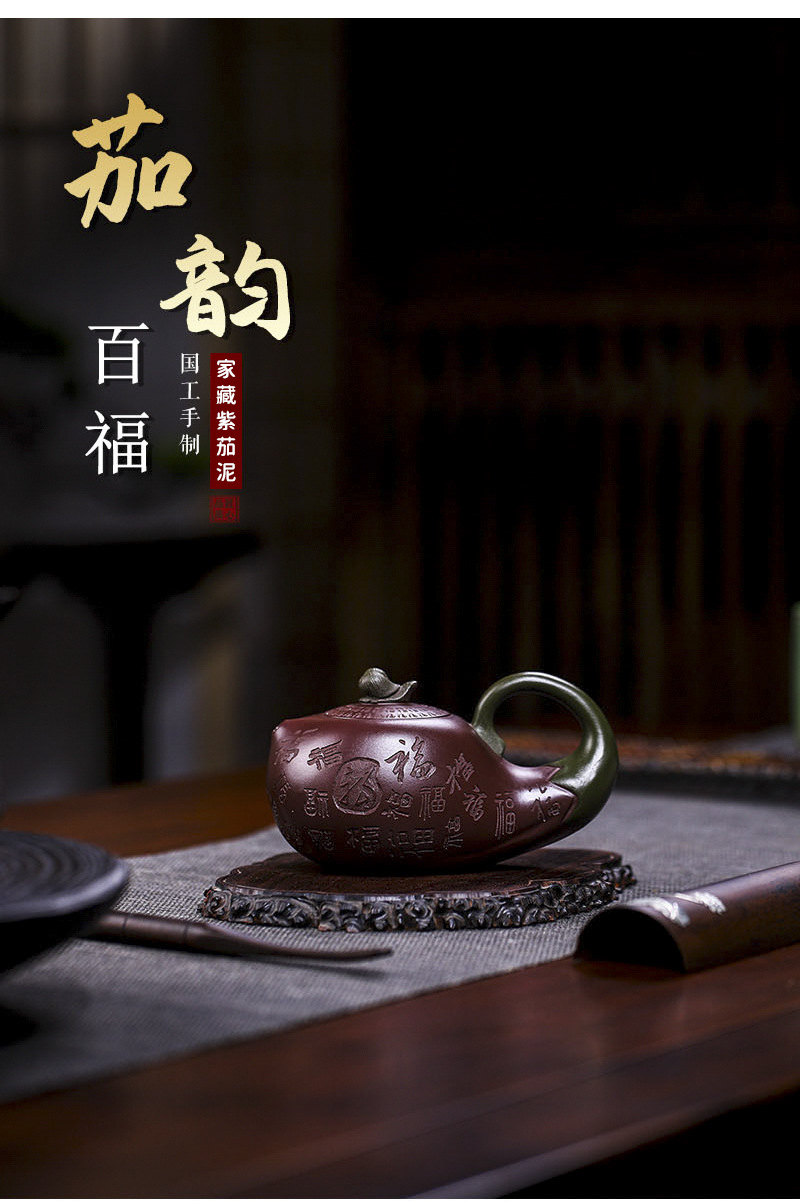 商品名称:宜兴手工紫砂壶证书全家藏紫茄泥茄韵百福易包浆出水暴爽滴水不漏