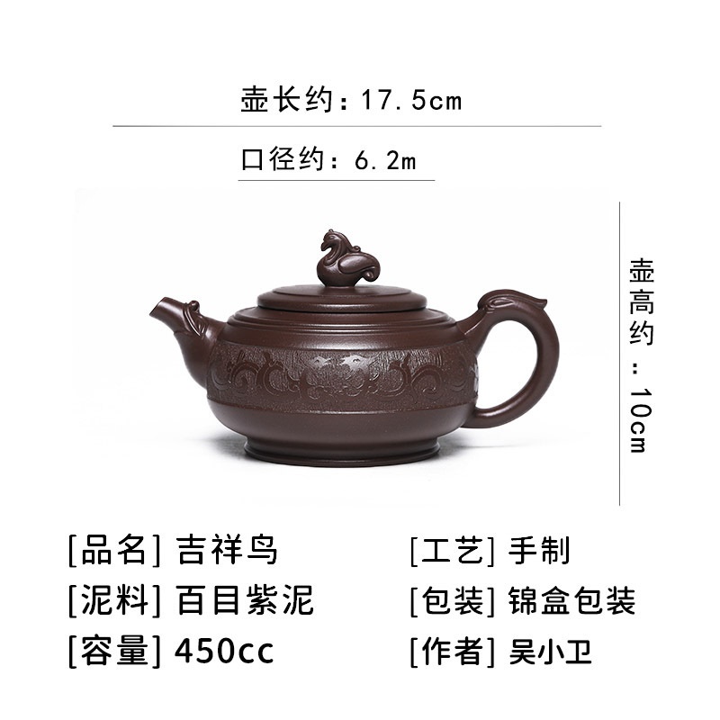 商品名称:宜兴手工紫砂壶证书全家藏百目紫泥吉祥鸟易包浆出水暴爽滴水不漏