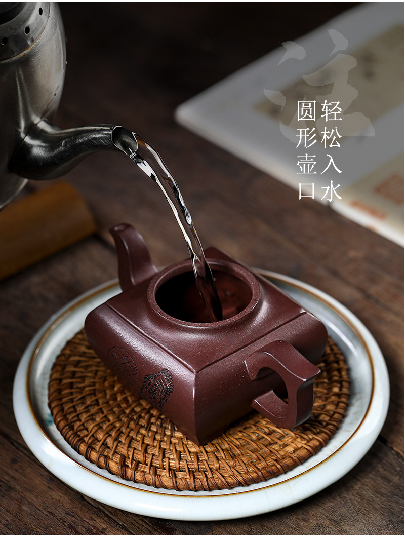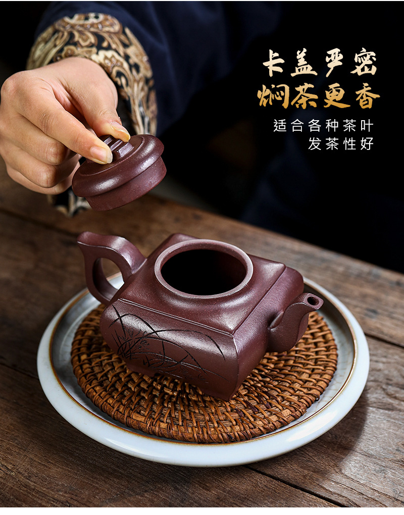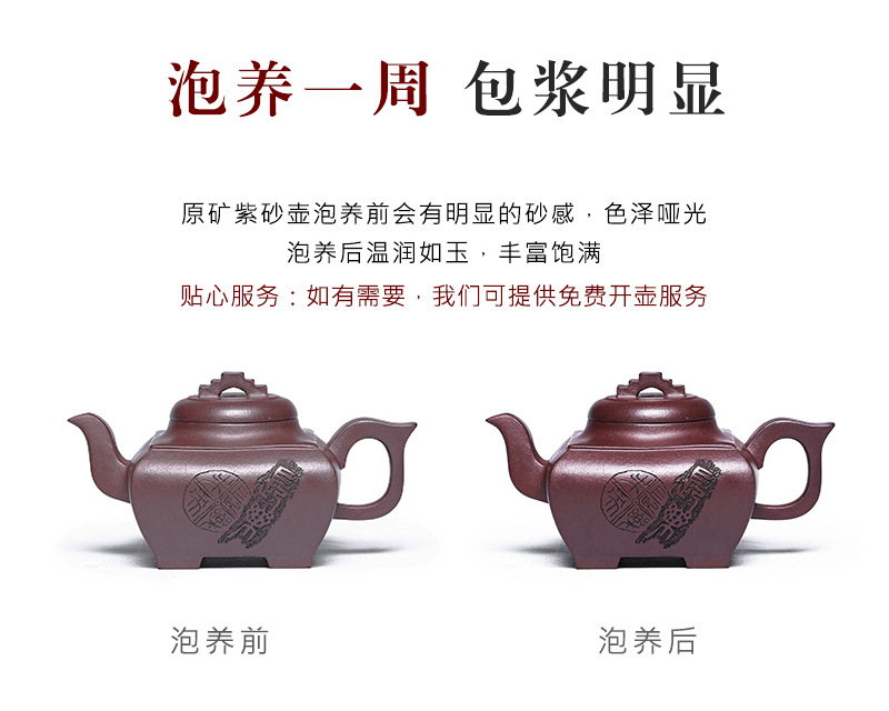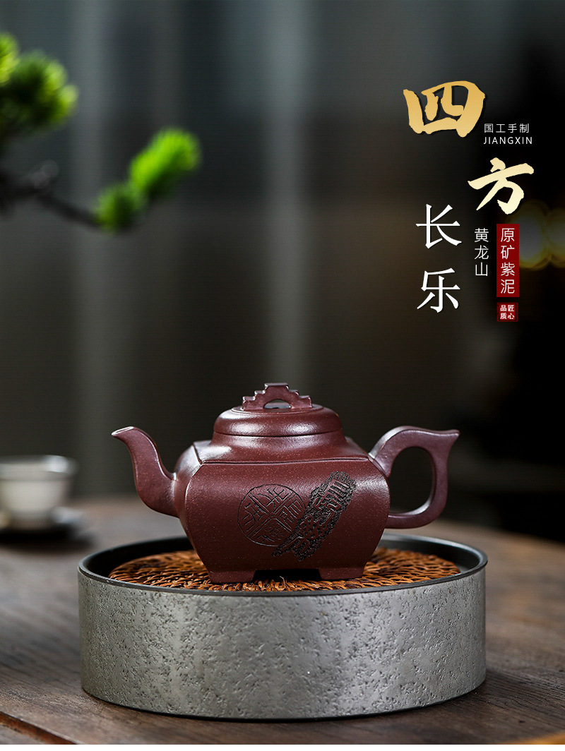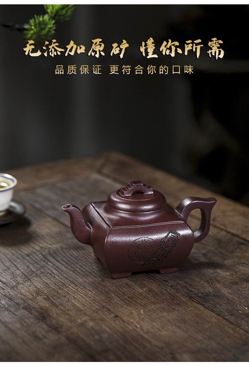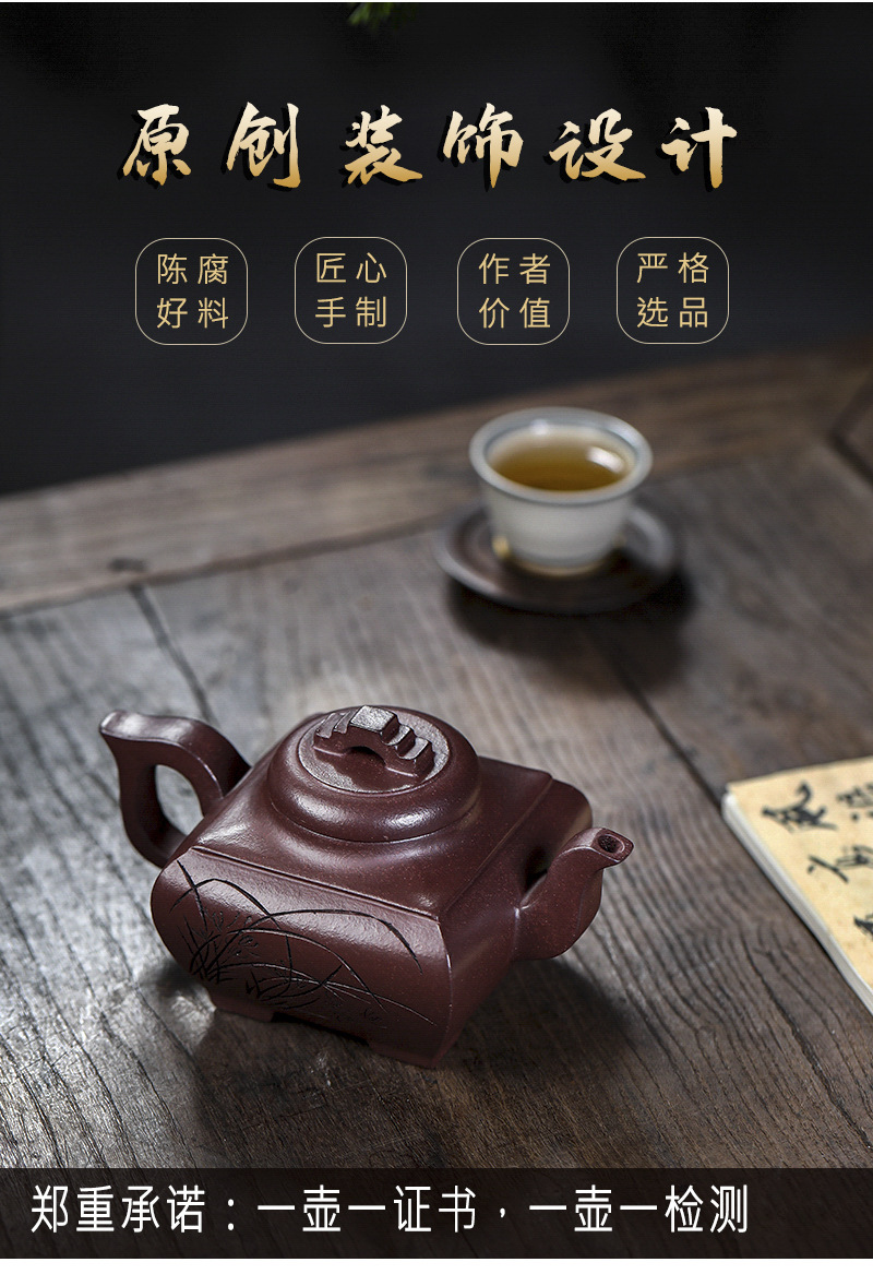 商品名称:宜兴手工紫砂壶证书全 原矿紫泥 四方长乐家用茶具茶壶出水暴爽