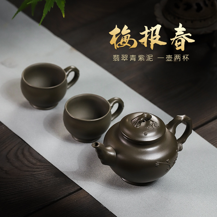 宜兴手工紫砂壶翡翠青紫泥梅报春一壶两杯家用茶具茶壶国工手制