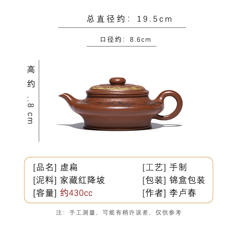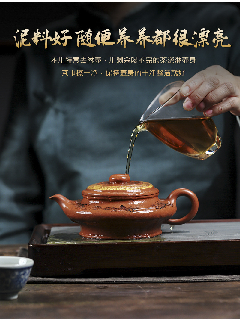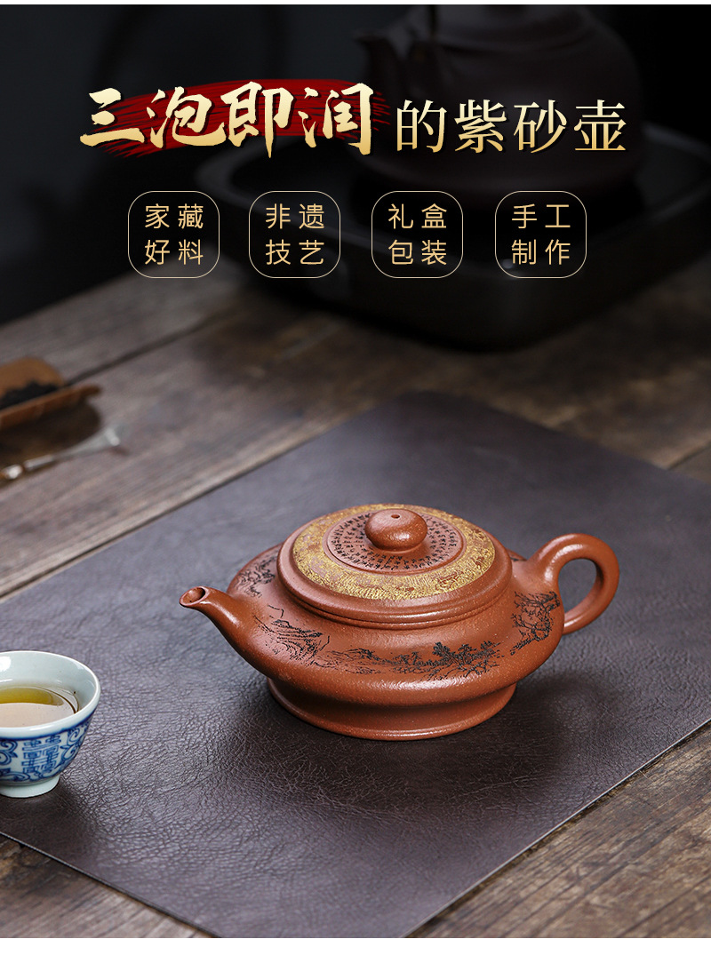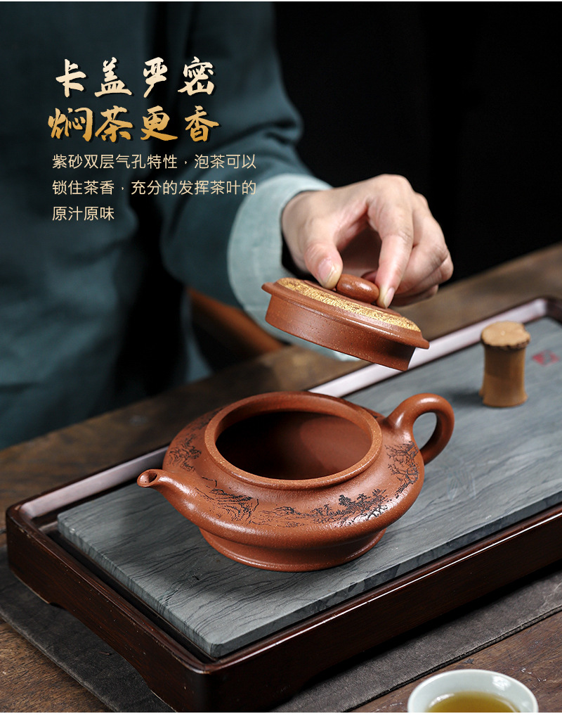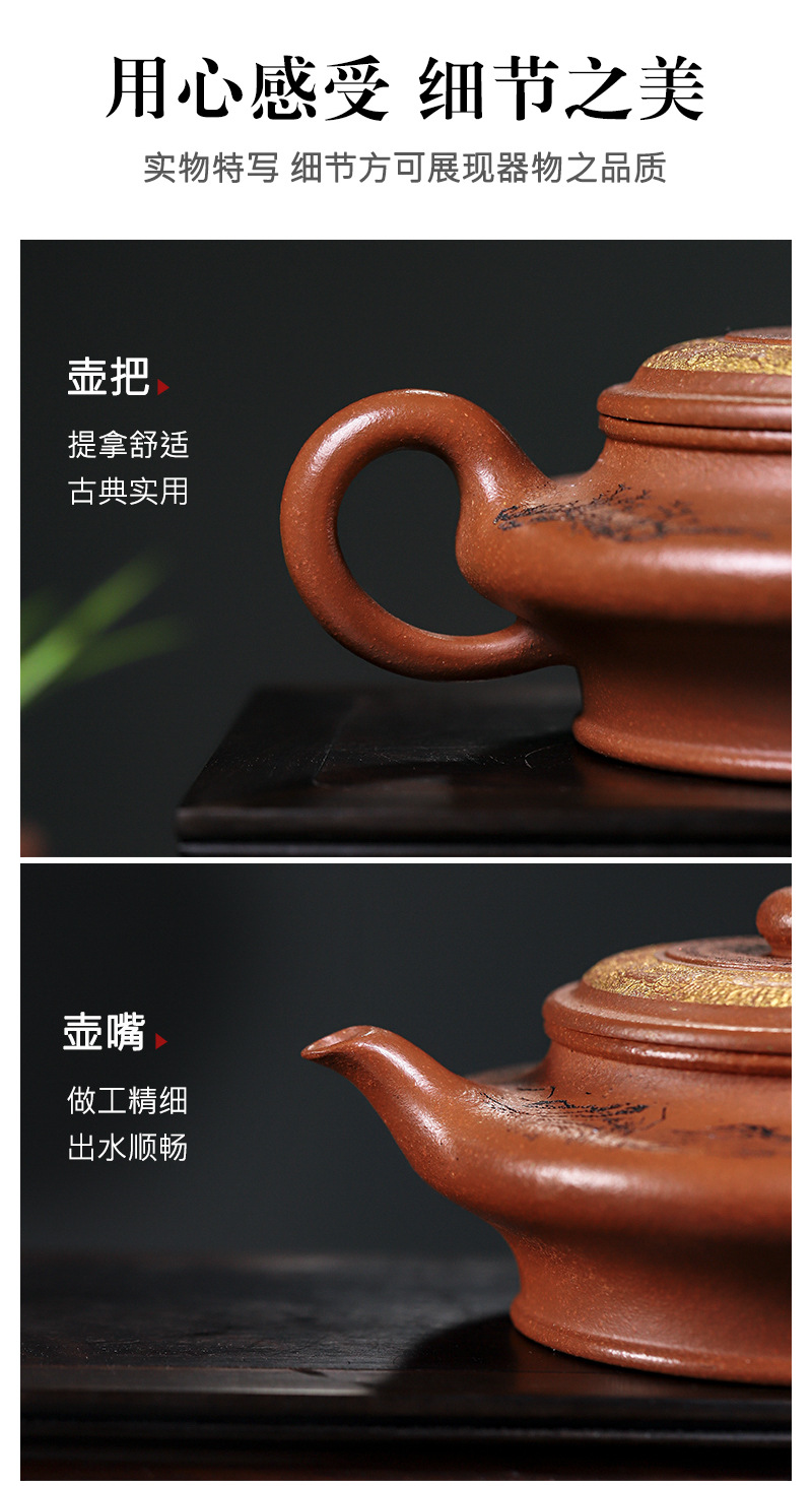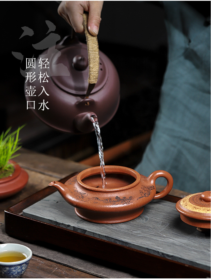 商品名称:宜兴手工紫砂壶家藏红降坡虚扁证书齐全家用泡茶壶出水爆爽大容量