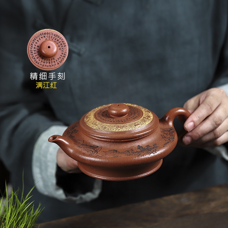 宜兴手工紫砂壶家藏红降坡虚扁证书齐全家用泡茶壶出水爆爽大容量