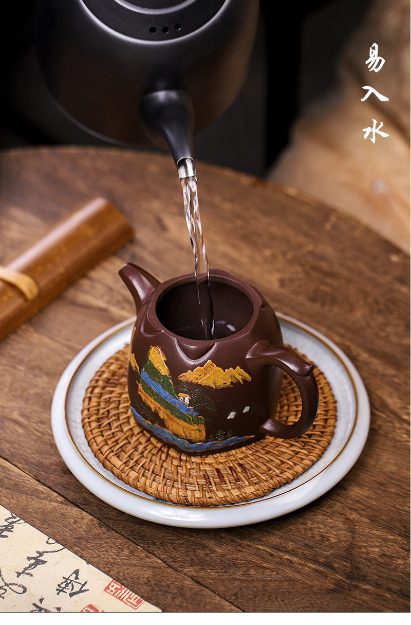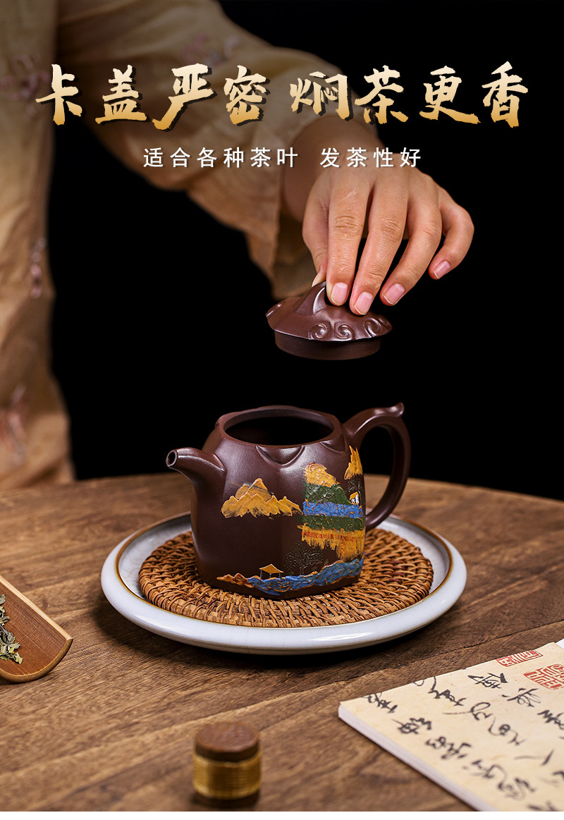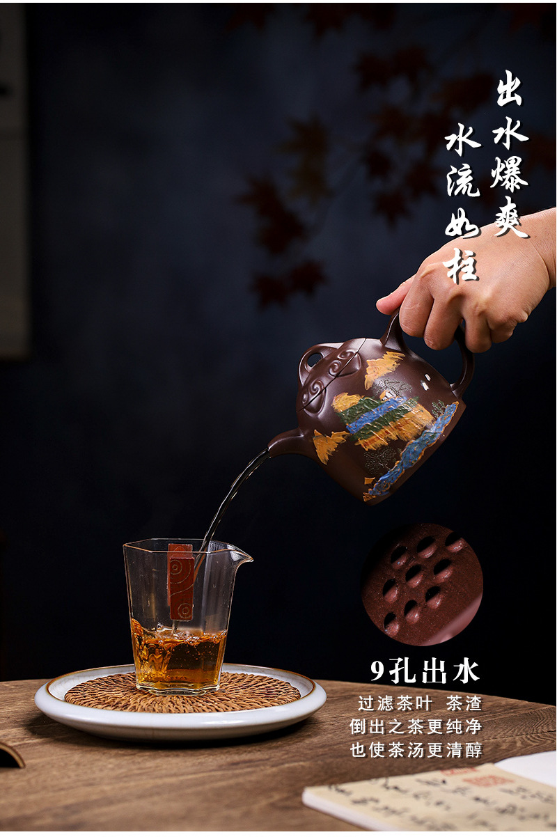 宜兴手工紫砂壶家藏紫茄泥山水秦权堆绘易包浆出水暴爽泡茶养生壶