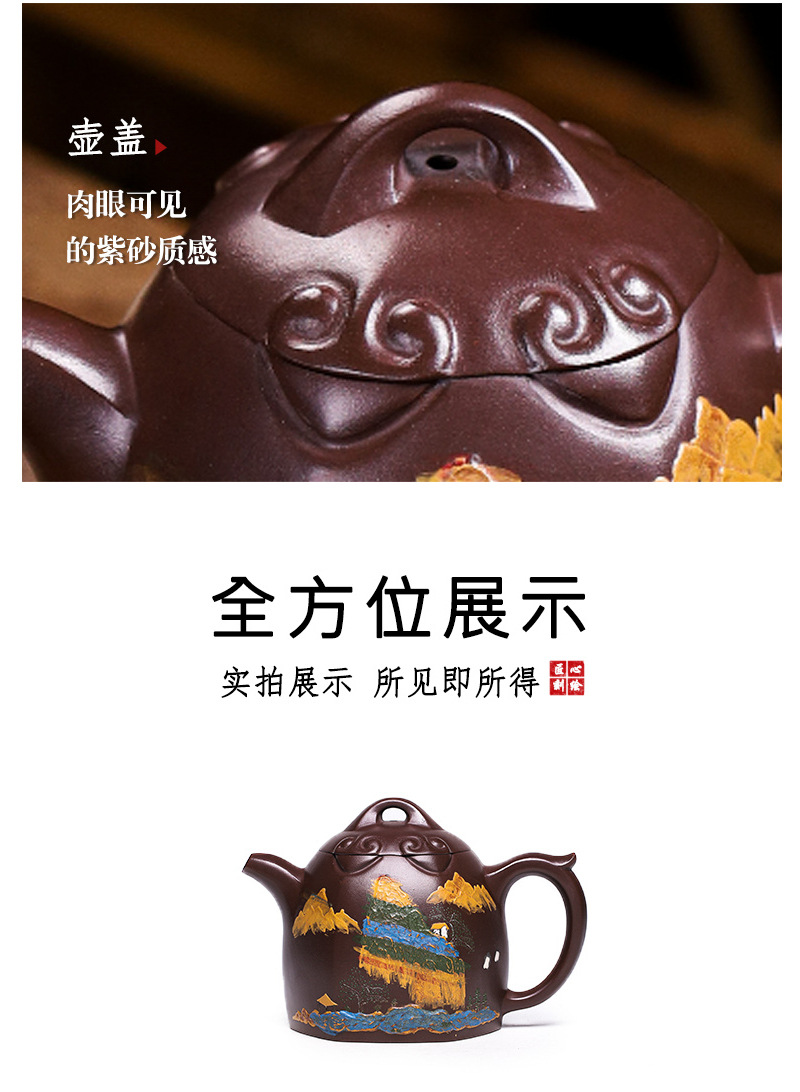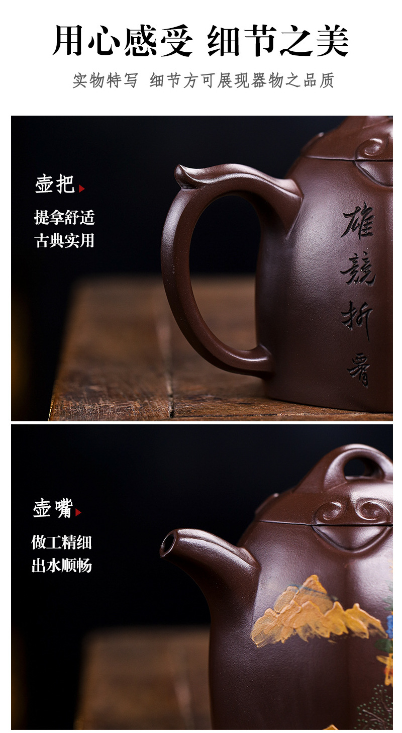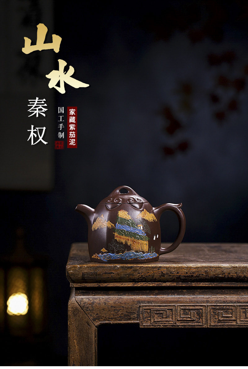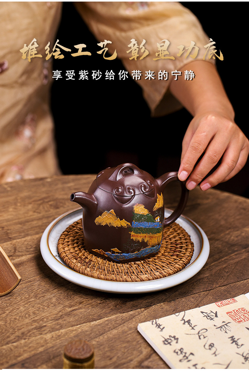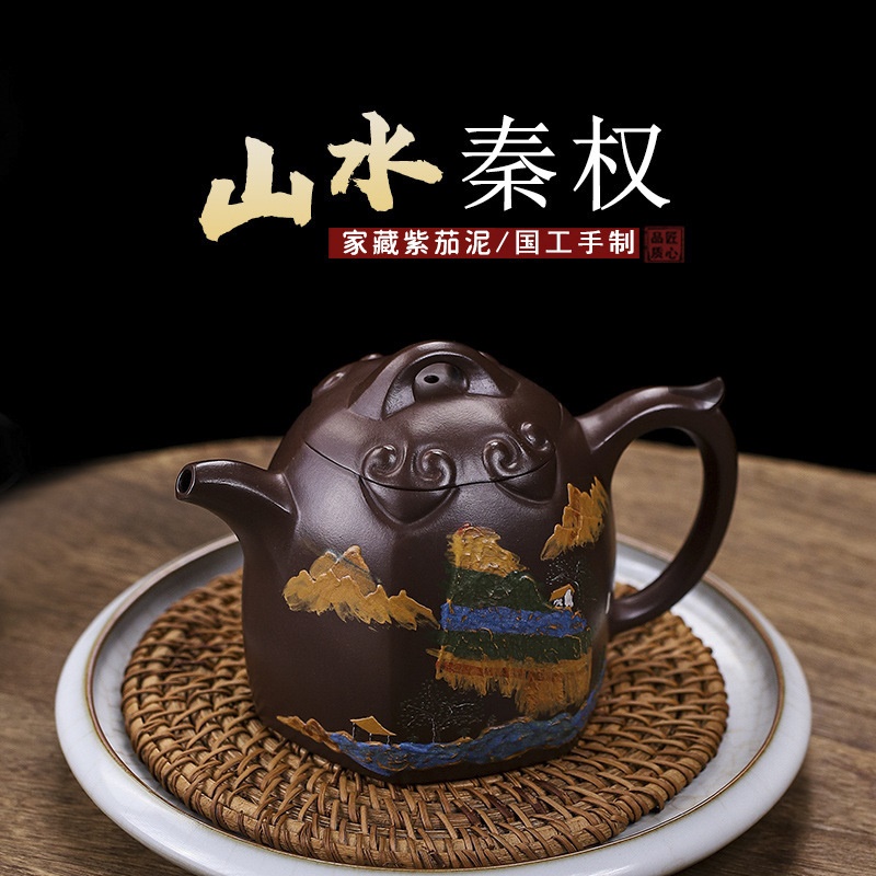 商品名称:宜兴手工紫砂壶家藏紫茄泥山水秦权堆绘易包浆出水暴爽泡茶养生壶