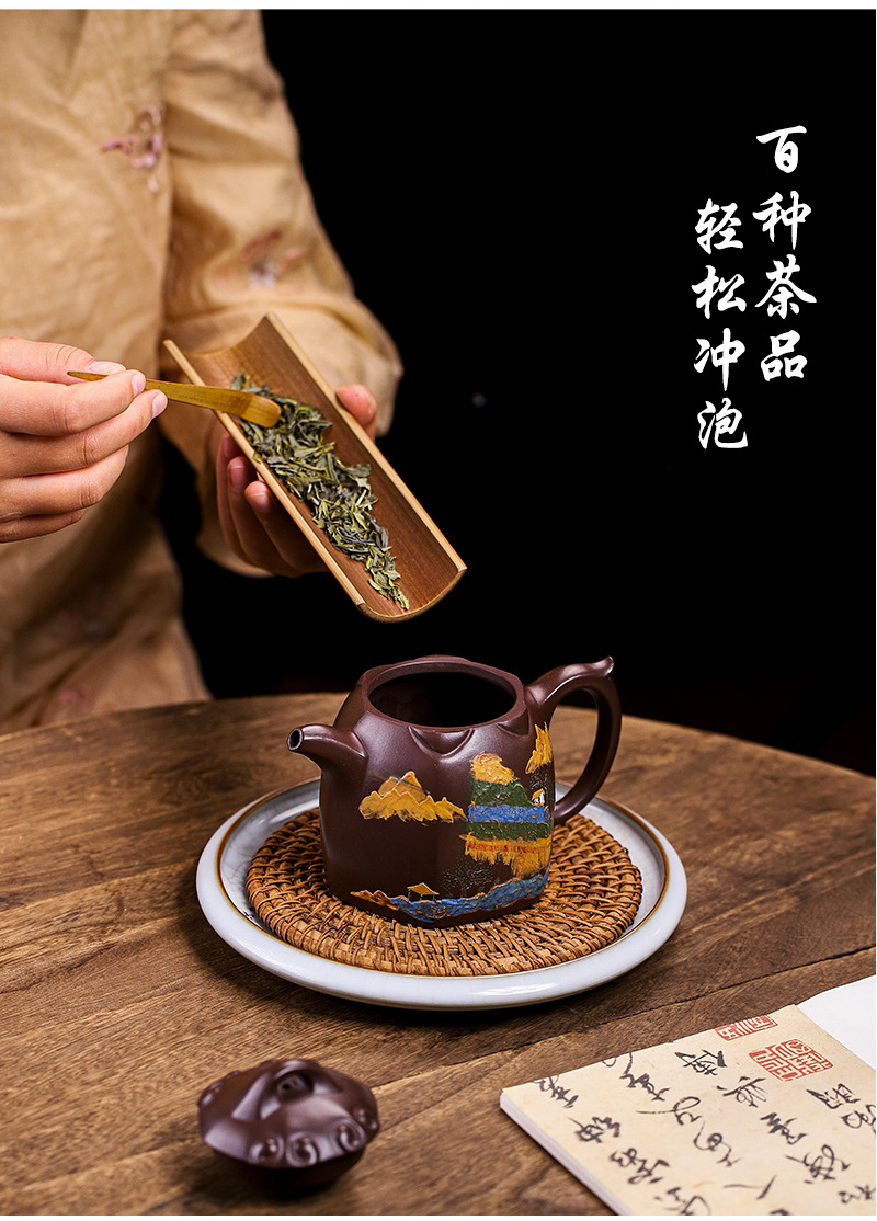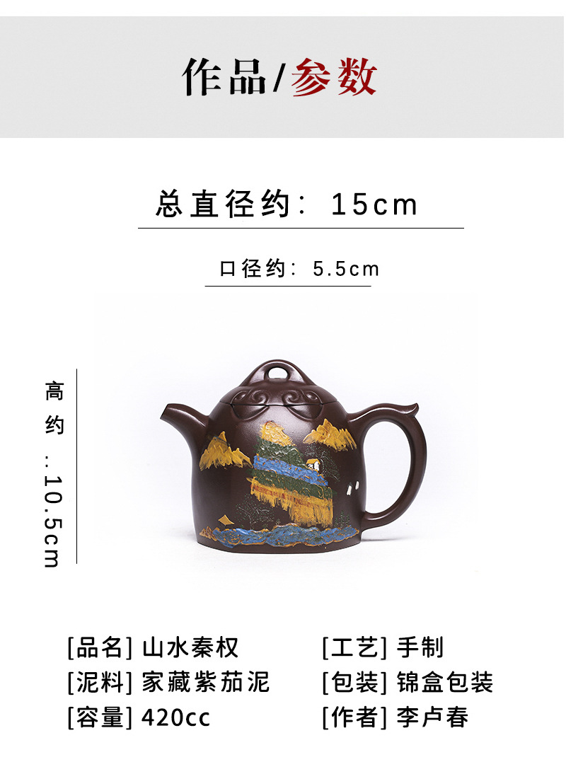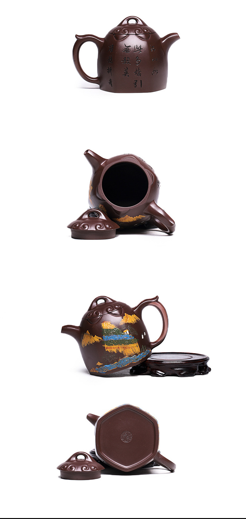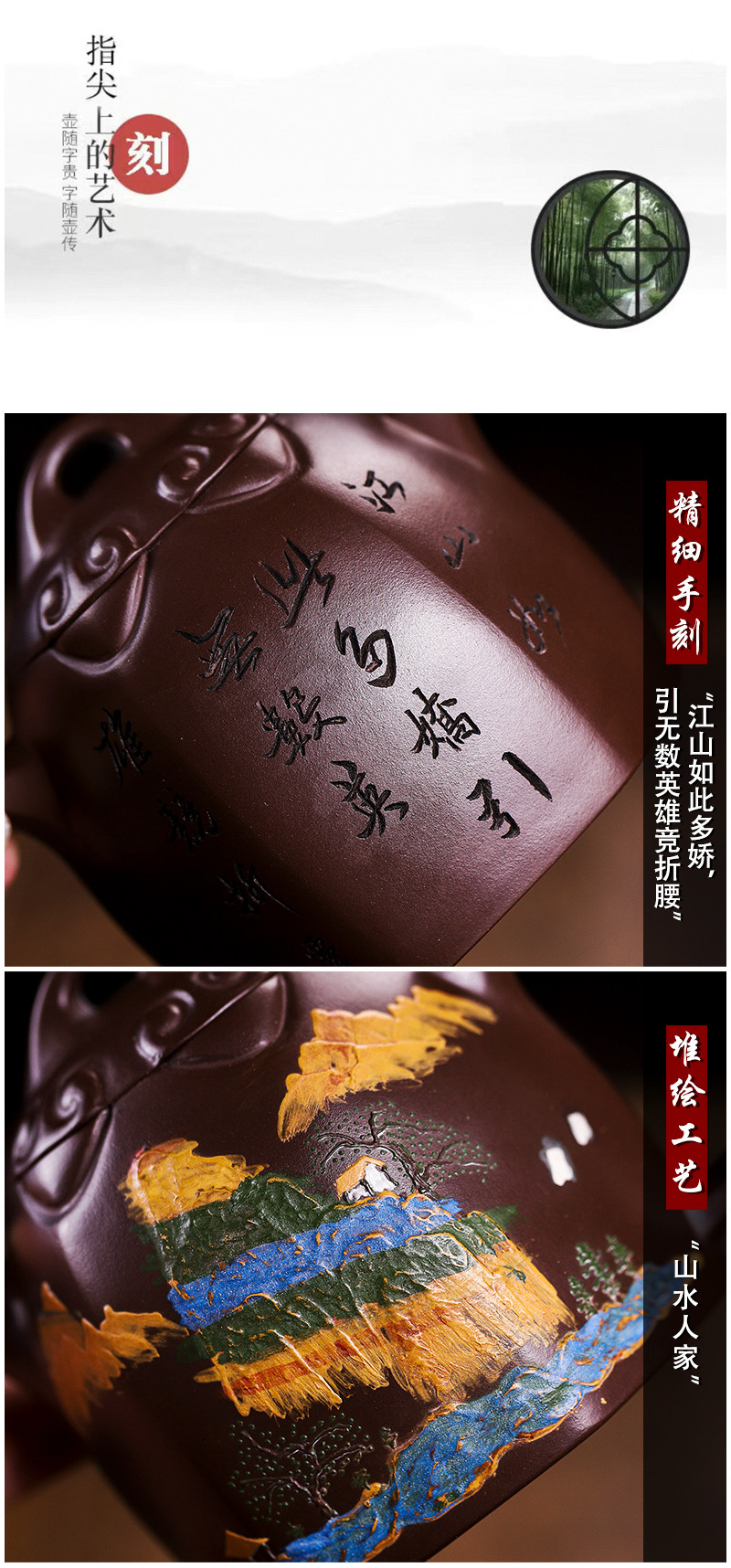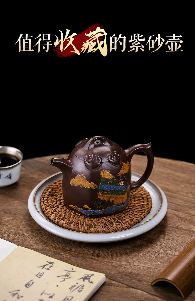 商品名称:宜兴手工紫砂壶家藏紫茄泥山水秦权堆绘易包浆出水暴爽泡茶养生壶