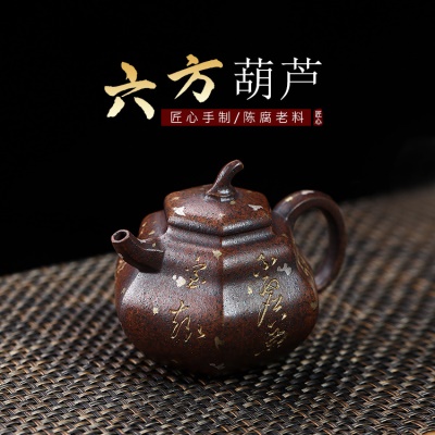 宜兴手工紫砂壶段泥柴烧六方葫芦家用茶具茶壶