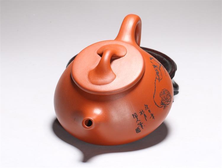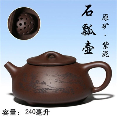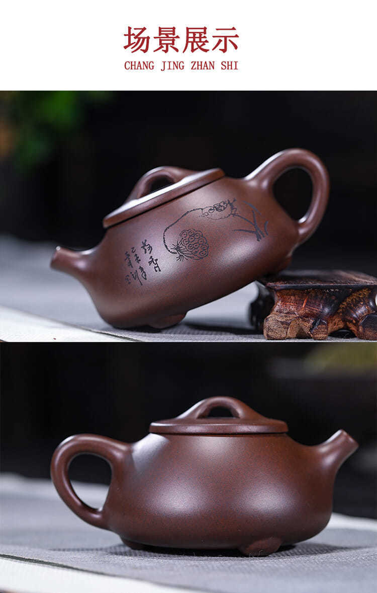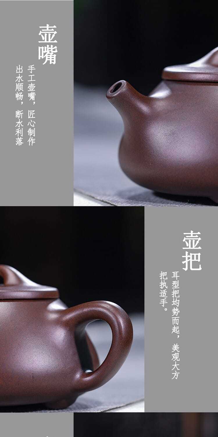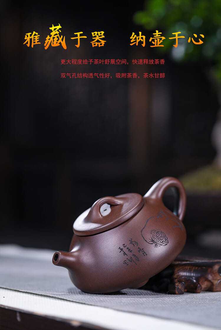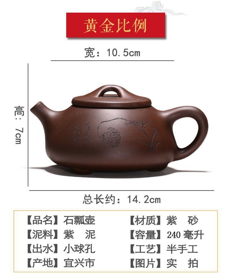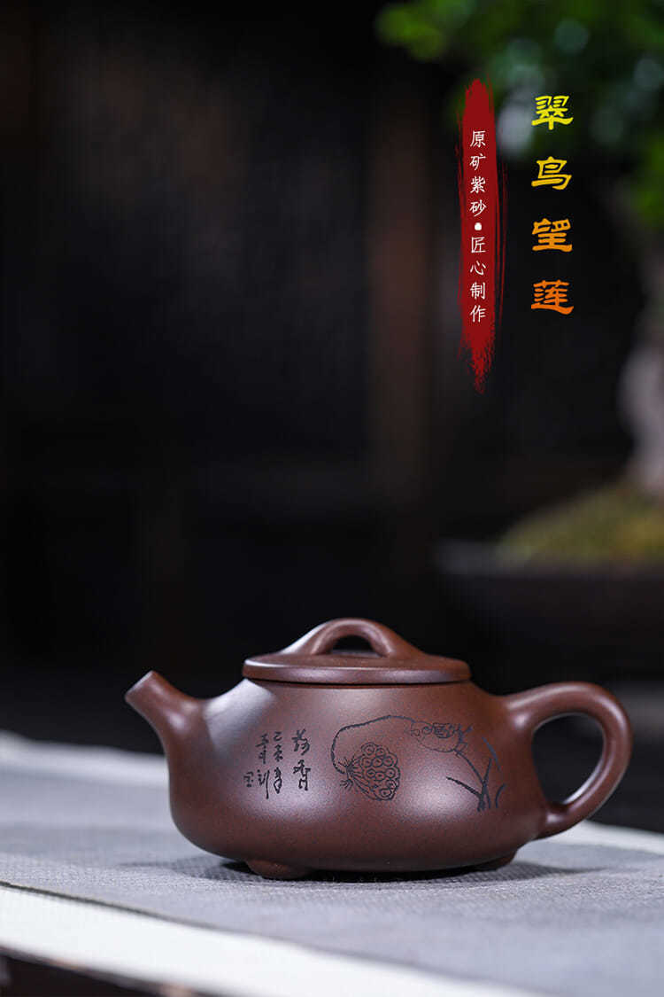 商品名称:宜兴正品原矿紫泥经典景舟石瓢翠鸟望莲240毫升 紫砂茶壶