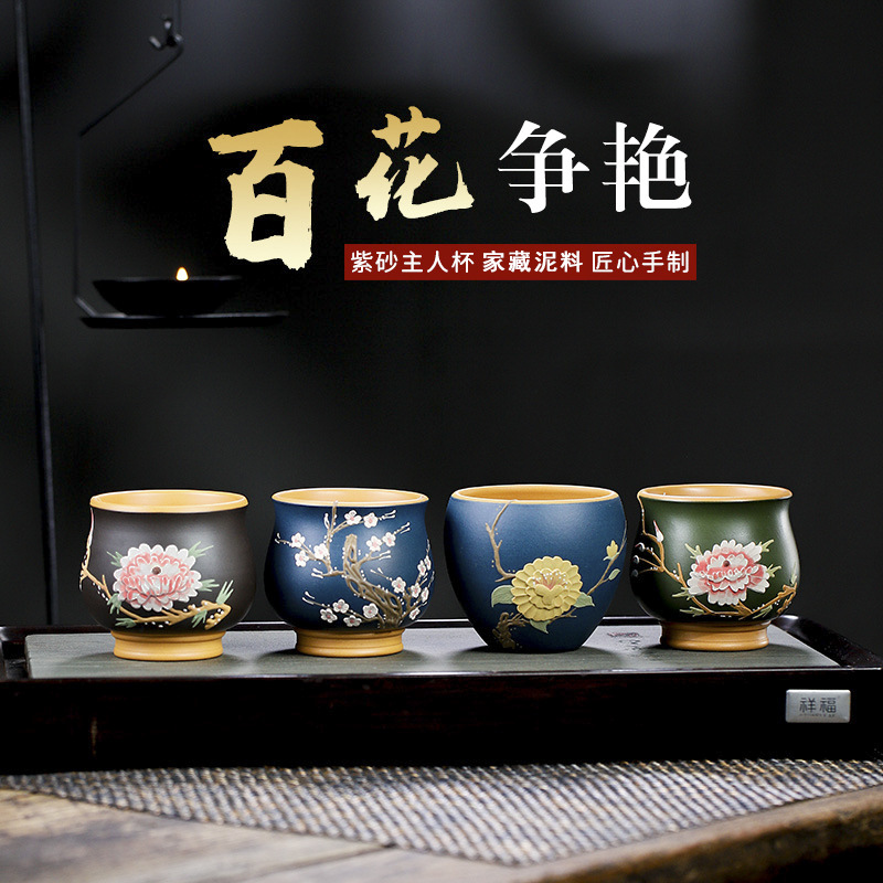 宜兴手工紫砂杯百花争艳牡丹黄菊梅花杯主人杯大口品茗杯功夫茶